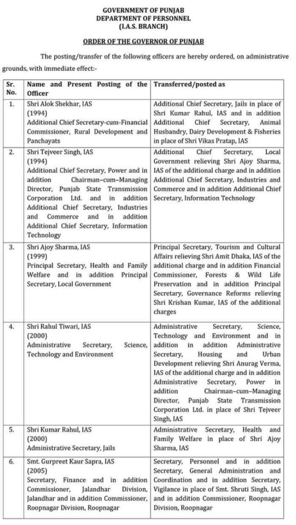 पंजाब सरकार ने ट्रांसफर सूची जारी करते हुए 9 सीनियर IAS अधिकारियों का तबादला कर दिया है।