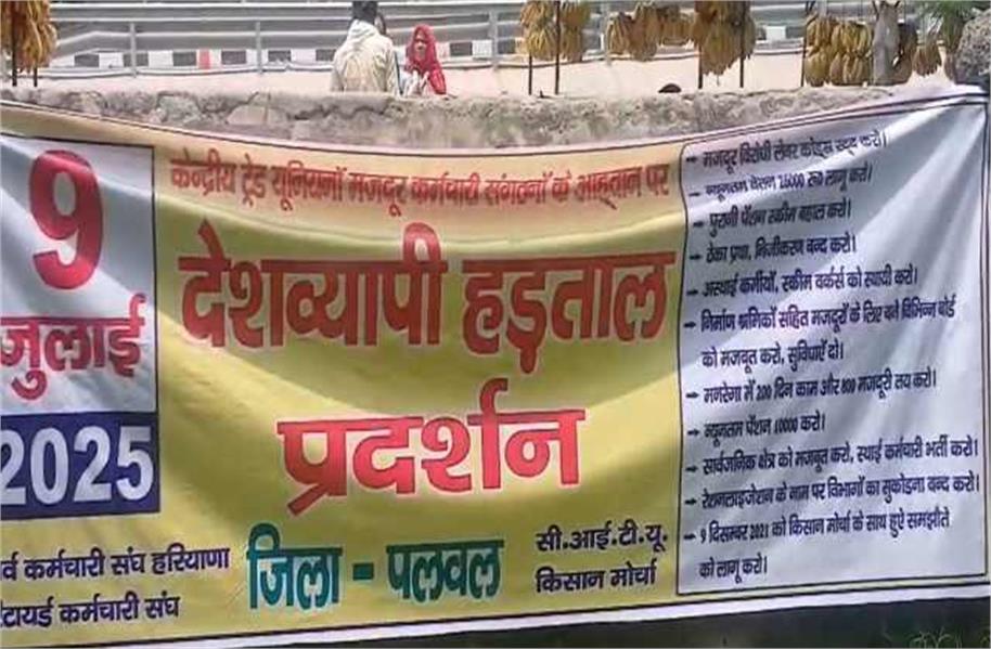 09 जुलाई 2025 : हरियाणा में केंद्रीय ट्रेड यूनियनों और कर्मचारी संघों के आह्वान पर बुधवार को कर्मचारी व मजदूर संगठन हड़ताल पर चले गए हैं। प्रदेश के 40 से अधिक विभागों के कर्मचारियों के अलावा 55 बोर्ड और निगमों के 3 लाख कर्मचारी हड़ताल में शामिल हुए। जानते हैं जिले वार इस हड़ताल का असर…