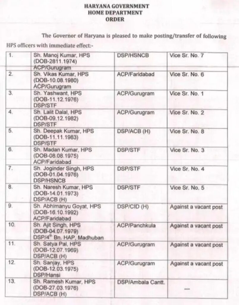 11 आईपीएस अधिकारियों की नई पोस्टिंग प्रमोशन के आधार पर की गई है। यह आदेश हरियाणा मुख्यमंत्री कार्यालय (CMO) की ओर से जारी किए गए हैं।