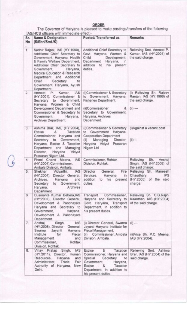 • IAS सुधीर राजपाल – महिला एवं बाल कल्याण विभाग के एडिशनल चीफ सेक्रेटरी की अतिरिक्त जिम्मेदारी।