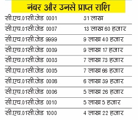 इस बार 0001 नंबर 31 लाख रुपए में बिका। वहीं पहले 0001 नंबर 25 लाख रुपए में नीलाम हुआ था। उक्त सीरीज के वाहन पंजीकरण नंबर (फैंसी और चॉइस) के साथ-साथ पिछली सीरीज से बचे हुए फैंसी-विशेष पंजीकरण नंबरों की ई-नीलामी से चंडीगढ़ की रजिस्टरिंग एवं लाइसैंसिंग अथॉरिटी ने 2,94,21000 रुपए राजस्व प्राप्त किया है।