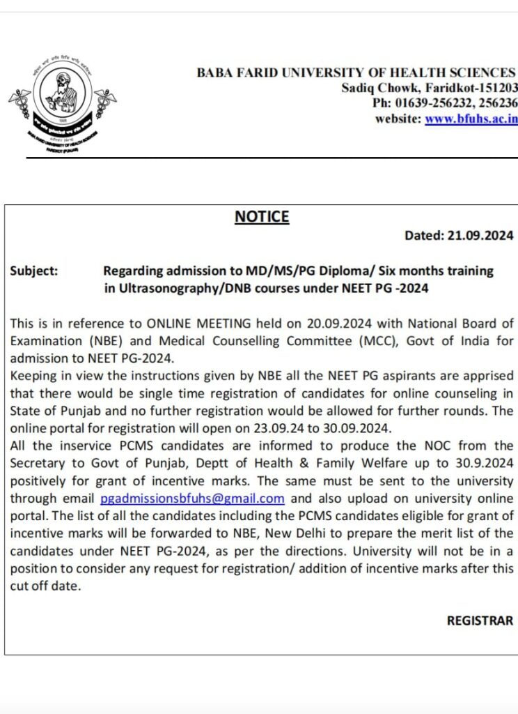 सभी इनसर्विस PCMS उम्मीदवारों को सूचित किया जाता है कि वे प्रोत्साहन अंकों की मंजूरी के लिए सकारात्मक रूप से 30-09-2024 तक पंजाब सरकार, स्वास्थ्य और परिवार कल्याण विभाग के सचिव को इतराजहीनता प्रमाण पत्र (NOC) प्रस्तुत करेंगे। इसे यूनिवर्सिटी को ईमेल pgadmissionsbfuhs@gmail.com के माध्यम से भेजा जाना चाहिए और यूनिवर्सिटी के ऑनलाइन पोर्टल पर भी अपलोड किया जाएगा। निर्देशानुसार, NEET PG-2024 के तहत उम्मीदवारों की मेरिट सूची तैयार करने के लिए प्रोत्साहन अंकों (Incentive Marks) के लिए योग्य PCMS उम्मीदवारों सहित सभी उम्मीदवारों की सूची राष्ट्रीय परीक्षा बोर्ड (NBE), नई दिल्ली को भेजी जाएगी। यूनिवर्सिटी की इस कट ऑफ तारीख के बाद उम्मीदवार के प्राप्त अंकों में प्रोत्साहन अंकों को जोड़ने की किसी भी अनुरोध पर विचार नहीं किया जाएगा।