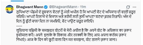 सीएम मान ने ट्वीट कर लिखा, “लुधियाना पश्चिम के समझदार मतदाताओं से मेरी अपील है कि वे अपने मताधिकार का प्रयोग करें। अपने क्षेत्र के विकास और तरक्की के लिए अपना कर्तव्य निभाएं। आज को छुट्टी का दिन न समझें, मतदान करने जरूर जाएं।”