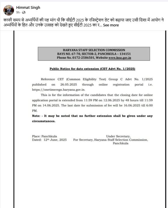 हरियाणा 13 जून 2025 : हरियाणा में कॉमन एलिजिबिलिटी टेस्ट (CET) के लिए आवेदन करने की डेट को बढ़ा दिया गया है। अब 14 जून रात 11:59 तक आवेदन कर सकेंगे। वहीं 16 जून की शाम 6 बजे तक ऑनलाइन फीस जमा कर सकेंगे। CET के लिए रजिस्ट्रेशन का आज आखिरी दिन था।