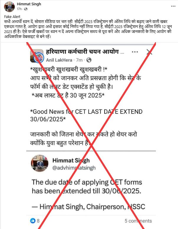 हरियाणा 12 जून 2025 : हरियाणा में CET के लिए रजिस्ट्रेशन प्रक्रिया चल रही है। कॉमन एलिजिबिलिटी टेस्ट (सीईटी) रजिस्ट्रेशन का आज अंतिम दिन है। आज रात 12 बजे तक युवा अप्लाई कर पाएंगे। इसके बाद 14 जून तक कैंडिडेट्स फीस जमा करवा सकते हैं। अब साइबर ठगों ने सीईटी के लिए फर्जी पोर्टल के बाद सोशल मीडिया पर फर्जी पेज बनाने शुरू कर दिए हैं। साथ ही इन पेजों पर अफवाह फैलाई जा रही है कि CET रजिस्ट्रेशन के लिए डेट बढ़ा दी गई है।