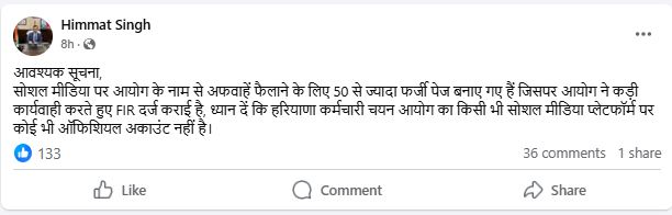 हरियाणा स्टाफ सिलेक्शन कमीशन (HSSC) के चेयरमैन हिम्मत सिंह ने बताया कि 50 फर्जी पेज बनाए गए हैं। हमने इसके खिलाफ FIR दर्ज करवा दी है। कमीशन का सोशल मीडिया पर कोई भी ऑफिशियल पेज नहीं है।