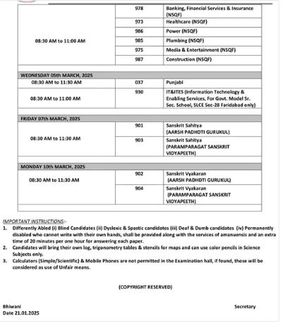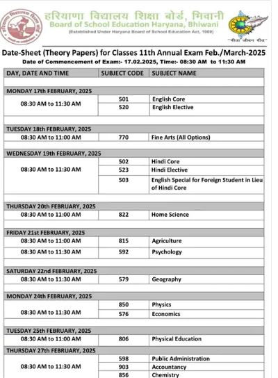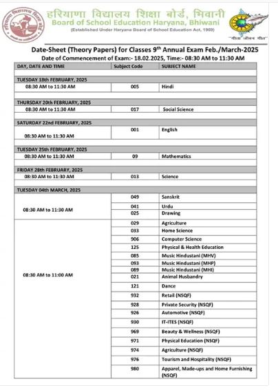 22 जनवरी 2025 हरियाणा की 9वीं और 11वीं क्लास की वार्षिक परीक्षाओं की डेटशीट की घोषणा कर दी है। हरियाणा विद्यालय शिक्षा बोर्ड (HBSE), भिवानी की ओर से जारी अधिसूचना में कहा कि 11वीं की परीक्षा 17 फरवरी से तो 9वीं की परीक्षा 18 फरवरी से शुरू होगी। इसके अलावा HBSE ने अधिसूचना में लिखा कि परीक्षा के दौरान कैलकुलेटर और मोबाइल के इस्तेमाल पर पूरी पाबंदी रहेगी।