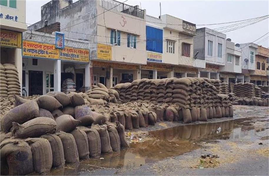 कैथल: बारिश में भीगी गेहूं की बोरियां, किसान ने लगाए आरोप