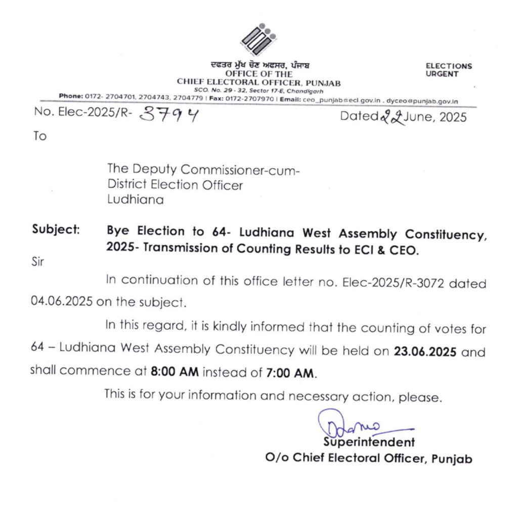 लुधियाना 22 जून 2025 : लुधियाना वेस्ट विधानसभा क्षेत्र हुए उपचुनाव के नतीजों से जुड़ी बड़ी खबर सामने आई है। जानकारी के अनुसार लुधियाना वेस्ट विधानसभा क्षेत्र में होने वाले उपचुनाव की मतगणना अब 23 जून 2025 को सुबह 8:00 बजे से शुरू की जाएगी। पहले यह प्रक्रिया सुबह 7:00 बजे निर्धारित थी, लेकिन अब इसमें बदलाव कर दिया गया है।
