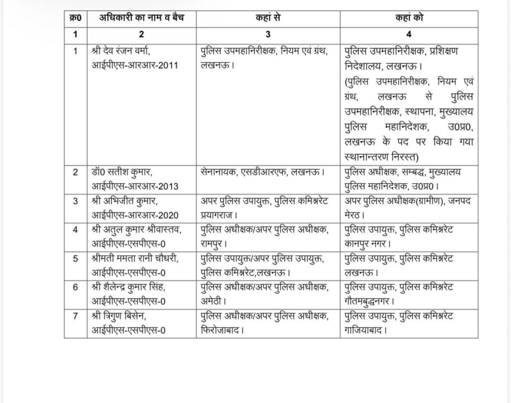अतुल कुमार श्रीवास्तव, आईपीएस-एसपीएस-0 पुलिसअधीक्षक/अपर पुलिस अधीक्षक, रामपुर कोपुलिस उपायुक्त, पुलिस कमिश्नरेट कानपुर नगर भेजा गया है। ममता रानी चौधरी, आईपीएस-एसपीएस-0पुलिसउपायुक्त/अपर पुलिस उपायुक्त, पुलिस कमिश्नरेट, लखनऊ को पुलिस उपायुक्त, पुलिस कमिश्नरेटलखनऊ।शैलेन्द्र कुमार सिंह, आईपीएस-एसपीएस-0 पुलिस अधीक्षक/अपर पुलिस अधीक्षक, अमेठी से पुलिस उपायुक्त, पुलिस कमिश्नरेटगौतमबुद्धनगर में नियुक्त किया गया है। त्रिगुण बिसेन, आईपीएस-एसपीएस-0 पुलिसअधीक्षक/अपर पुलिस अधीक्षक, फिरोजाबाद से3पुलिस उपायुक्त, पुलिस कमिश्नरेट गाजियाबाद में भेजा गया है।
