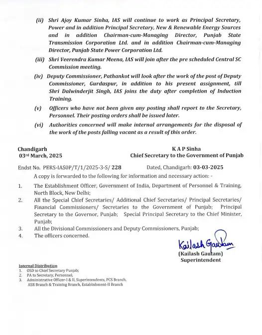03 मार्च 2025 : पंजाब में बड़ा प्रशासनिक फेरबदल किया गया है। सरकार ने 43 IAS/PCS अधिकारियों के तबादले के आदेश जारी किए हैं, जिसमें कई अहम पदों पर नए अधिकारियों की नियुक्ति की गई है। इस बदलाव से प्रशासनिक व्यवस्था में बड़े परिवर्तन देखने को मिल सकते हैं। पूरी लिस्ट देखने के लिए यहां पढ़ें।