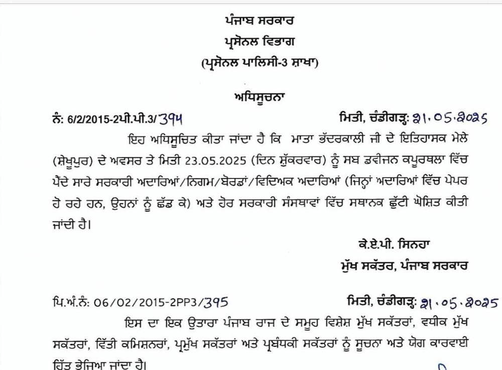 पंजाब सरकार के मुख्य सचिव के.पी. सिन्हा द्वारा जारी नोटिफिकेशन के अनुसार, सब-डिवीजन कपूरथला में आने वाले सरकारी कार्यालयों, निगमों, बोर्डों, शैक्षणिक संस्थानों एवं अन्य सरकारी संस्थाओं में अवकाश रहेगा। हालांकि, जिन शैक्षणिक संस्थानों में उस दिन परीक्षा होनी है, वहां परीक्षा पूर्व निर्धारित कार्यक्रम के अनुसार ही आयोजित की जाएगी। गांव शेखूपुर स्थित माता भद्रकाली मंदिर अब श्रद्धालुओं की आस्था का प्रमुख केंद्र बन चुका है। यहां 78वां वार्षिक मेला शुरू हो चुका है, जो 24 मई तक चलेगा। 22 मई को मंदिर से एक विशाल शोभायात्रा भी निकाली जाएगी।