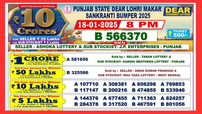 पंजाब 19 जनवरी 2025: पंजाब राज्य सरकार द्वारा लोहड़ी मकर संक्रांति बम्पर लॉटरी 2025 का परिणाम घोषित कर दिया गया है। आपको बता दें कि इस लॉटरी का पहला इनाम 10 करोड़ रुपये है। इसके साथ ही  ₹1 करोड़, ₹50 लाख, ₹10 लाख और ₹5 लाख तक के इनाम भी घोषित किए गए हैं। लॉटरी का प्रथम पुरस्कार B566370 नंबर की टिकट का लगा है, और इस टिकट को खदीदने वाले को 10 करोड़ रुपये मिलेंगे। इसके साथ ही लुधियाना के व्यक्ति का दूसरा एक करोड़ रुपए का ईनाम निकला है।