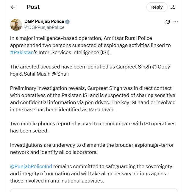 पंजाब 22 जून 2025 : पंजाब पुलिस के हाथ बड़ी सफलता लगी है। अमृतसर देहाती ने दो लोगों को गिरफ्तार किया है जो पाकिस्तान की ISI के साथ संपर्क में थे। अमृतसर ग्रामीण पुलिस ने पाकिस्तान की इंटर-सर्विसेज इंटेलिजेंस (ISI) से जुड़ी जासूसी गतिविधियों के संदिग्ध दो व्यक्तियों को गिरफ्तार किया। गिरफ्तार आरोपियों की पहचान गुरप्रीत सिंह उर्फ गोपी फोजी और साहिल मसीह उर्फ शाली के रूप में हुई है। इस मामले को लेकर डी.जी.पी. का ट्वीट भी सामने आया है।