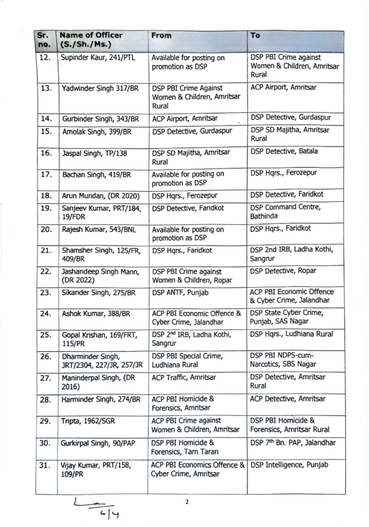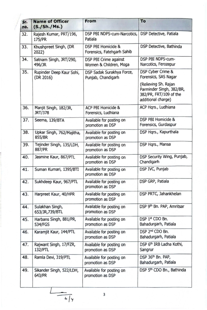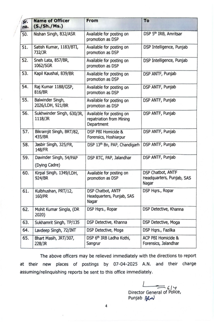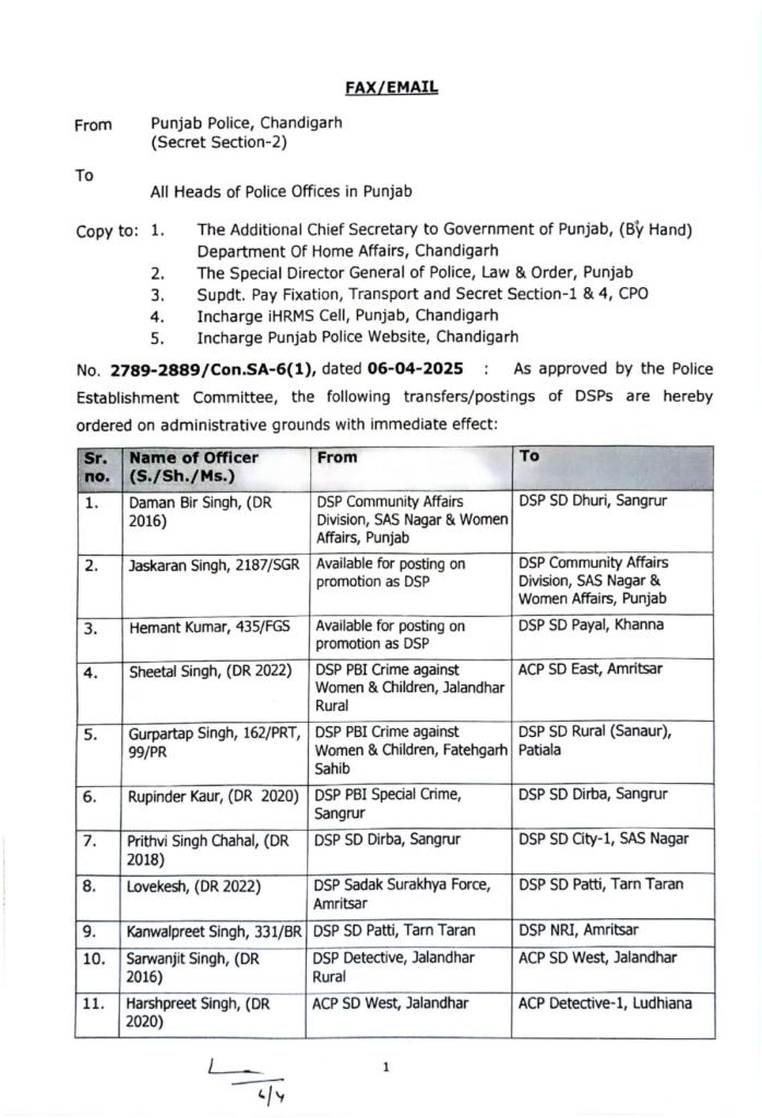 पंजाब पुलिस DSP तबादला आदेश: 6 अप्रैल 2025 तक के ताज़ा बदलावों की जानकारी
