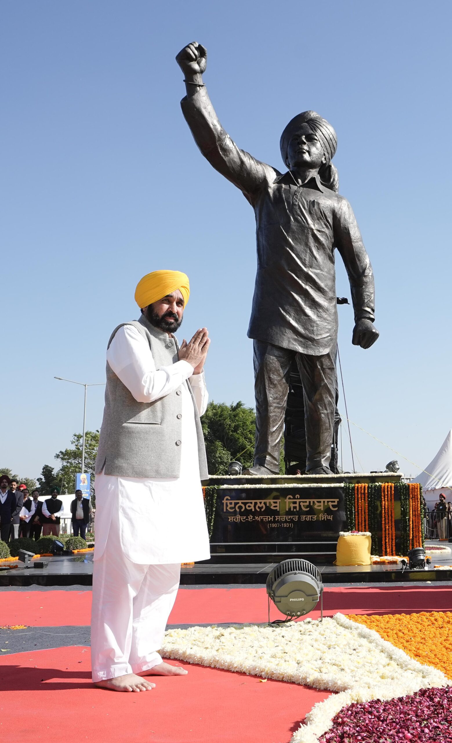 यहां एयरपोर्ट रोड पर 5 करोड़ रुपये की लागत वाले ‘निशान-ए-इंकलाब’ प्लाज़ा, जहां शहीद भगत सिंह की 30 फुट ऊंची कांस्य प्रतिमा स्थापित है, को जनता को समर्पित करते हुए मुख्य मंत्री ने कहा कि इस महान शहीद को सिर्फ उनके शहीदी दिवस (23 मार्च) या जन्मदिन (28 सितंबर) पर ही याद नहीं किया जाना चाहिए, बल्कि हर पल याद किया जाना चाहिए। उन्होंने कहा कि यह प्लाज़ा हमारी युवा पीढ़ियों को महान शहीद के नक्शे-कदमों पर चलने और देश की सेवा करने के लिए हमेशा प्रेरित करेगा। भगवंत मान ने आशा व्यक्त की कि यह प्लाज़ा इस महान शहीद के योगदान से अवगत कराकर देश-विदेश से आने वाले मुसाफिरों के लिए मार्गदर्शक साबित होगा।