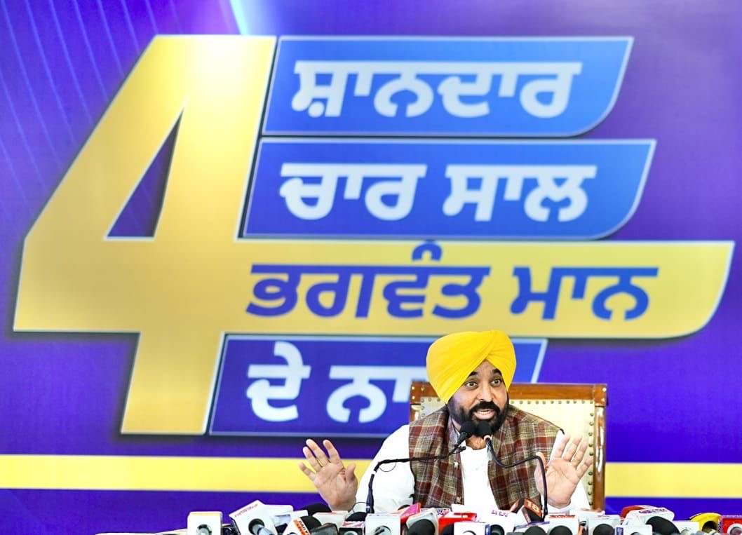 चंडीगढ़, 16 मार्च 2026* आम आदमी पार्टी की सरकार के चार वर्ष पूरे होने पर पंजाब के मुख्यमंत्री भगवंत सिंह मान ने आज कहा कि उनकी सरकार ने ‘काम की राजनीति’ के रास्ते लोगों को दी गई सभी गारंटियां पूरी कर दी हैं। उन्होंने कहा कि लोगों ने कांग्रेस, शिरोमणि अकाली दल और भाजपा को ठुकराकर हम पर उम्मीदें लगाई थी और हमने लोगों का भरोसा नहीं टूटने दिया। मुख्यमंत्री ने मुख्य उपलब्धियों का जिक्र किया, जिनमें मुफ्त बिजली, किसानों के लिए दिन में बिजली, 78 प्रतिशत खेतों को नहरी पानी, 65,000 सरकारी नौकरियां और 5.5 लाख रोजगार के नए मौके, आम आदमी क्लिनिकों के माध्यम से स्वास्थ्य सुविधाओं का विस्तार और 10 लाख रुपए तक का मुफ्त इलाज शामिल हैं। उन्होंने यह भी कहा कि सरकार की नशा विरोधी अभियान ‘युद्ध नशे के विरुद्ध’, 1.55 लाख करोड़ रुपए का रिकॉर्ड निवेश और सड़क सुरक्षा फोर्स के साथ सरकार के इरादे स्पष्ट हैं कि पंजाब के पुनर्निर्माण पर ध्यान दिया जा रहा है। विपक्षी पार्टियों पर निशाना साधते हुए मुख्यमंत्री भगवंत सिंह मान ने कहा कि जहां कांग्रेस, अकाली और भाजपा सत्ता की चिंता कर रहे हैं, वहीं ‘आप’ सरकार पंजाब को बचाने के लिए फिक्रमंद है और राज्य में फूट डालो राजनीति को सफल नहीं होने देगी। ‘आप’ सरकार के चार साल पूरे होने पर पत्रकारों से बातचीत में मुख्यमंत्री भगवंत सिंह मान ने कहा, “पंजाब सरकार ने चार सालों में सभी वादे पूरे करके राजनीति में नई परंपरा कायम की है, जबकि पारंपरिक पार्टियां पांच सालों में भी ऐसा करने में सक्षम नहीं हैं।” उन्होंने आगे कहा, “साल 2022 में शहीद-ए-आजम भगत सिंह के पैतृक गांव में पदभार संभालने के बाद, पंजाब सरकार ने कई लोक-हितैषी फैसले लिए।” पंजाब के मुख्यमंत्री भगवंत सिंह मान ने आगे कहा, “मेरे साथ, लाखों पंजाबियों ने राज्य की पुरानी शान बहाल करने की शपथ ली थी।” *‘आप’ सरकार के चार साल पूरे, अब पंजाब को नई ऊंचाइयों पर ले जाने का लक्ष्य* अपनी सरकार की उपलब्धियों के बारे में बात करते हुए मुख्यमंत्री भगवंत सिंह मान ने कहा, “पिछले चार सालों में, पंजाब सरकार ने लोगों की भलाई के लिए अथक मेहनत और समर्पण भावना से प्रयास किए हैं और उनके साथ किए वादे पूरे कर दिए हैं।” उन्होंने आगे कहा, “आने वाला साल पंजाब को विकास और खुशहाली के एक नए शिखर पर ले जाने के लिए समर्पित होगा।” *शिक्षा क्रांति ने पंजाब के सरकारी स्कूलों की तस्वीर बदल दी* शिक्षा क्षेत्र में बदलाव का जिक्र करते हुए मुख्यमंत्री भगवंत सिंह मान ने कहा, “भारत सरकार के सर्वेक्षण के अनुसार पंजाब के सरकारी स्कूल अब पढ़ाई में देश में पहले स्थान पर हैं।” उन्होंने आगे कहा, “सरकारी स्कूलों में अब कोई भी बच्चा फर्श पर नहीं बैठता क्योंकि एक लाख से अधिक डेस्क दिए गए हैं ता