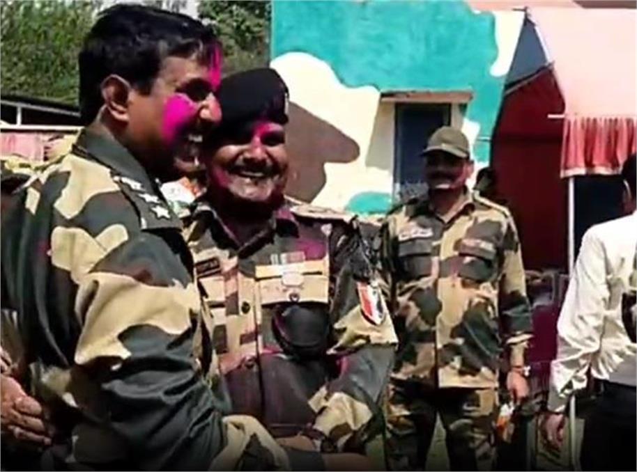 ऐसा ही कुछ BSF की भारतीय चौकी कमलजीत सिंह पोस्ट पर जहां बी.एस. एफ के जवानों और देश की खातिर शहीद हुए जवानों के परिवारों ने मिलकर होली मनाई। देश के लिए जान कुर्बान करने वाले जवानों के शहीद परिवारों ने भारत-पाक सरहद पर पहुंचकर होली के रंगों का तिलक बी.एस.एफ. के जवानं को लगाया और देश भक्ति के गीतों पर नाचकर सभी को होली की बधाई दी और पूरा इलाका भारत माता की जय से गूंज उठा।