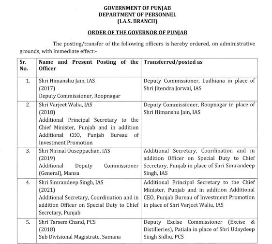 19 मार्च 2025 : पंजाब सरकार ने प्रशासनिक फेरबदल के तहत 1 पीसीएस और 4 आईएएस अधिकारियों के तबादले कर दिए हैं, जिनमें दो डिप्टी कमिश्नर भी शामिल हैं। यह बदलाव प्रशासनिक कार्यों को सुचारू रूप से संचालित करने और शासन में सुधार लाने के उद्देश्य से किया गया है।