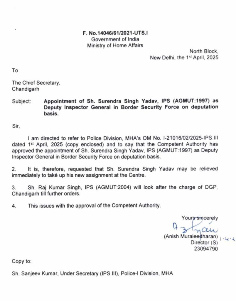 वहीं चंडीगढ़ पुलिस महानिदेशक (DGP) के पद का अतिरिक्त कार्यभार आई.पी.एस. अधिकारी राज कुमार सिंह को सौंपा गया है, जब तक कि नए आदेश नहीं दिए जाते। मंत्रालय ने यह भी अनुरोध किया है कि सुरेंद्र सिंह यादव को उनकी नई जिम्मेदारी संभालने के लिए शीघ्र राहत दी जाए।